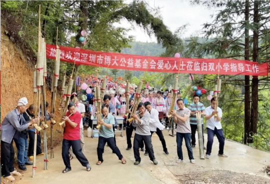 4月21日至22日,深圳市博大公益基金会理事长、集团董事长张炳来前往贵州省黎平县实地考察拟捐建学校场地,并回访2021年交付当地政府使用的务孖小学。当地群众载歌载舞,热烈欢迎理事长张炳来的到来。