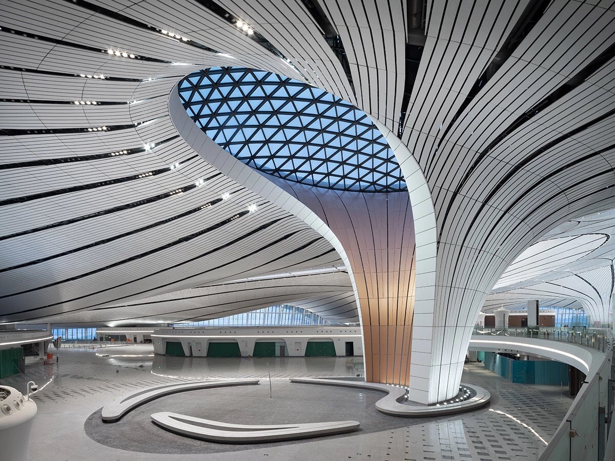 北京大兴国际机场航站楼形如展翅的凤凰,五指廊的造型完全以旅客为中心。整个航站楼有82个登机口,但是旅客从航站楼中心步行到达任何一个登机口,所需的时间不超过8分钟。博大建设集团承建了中南指廊国际出发到达区域室内装饰工程。